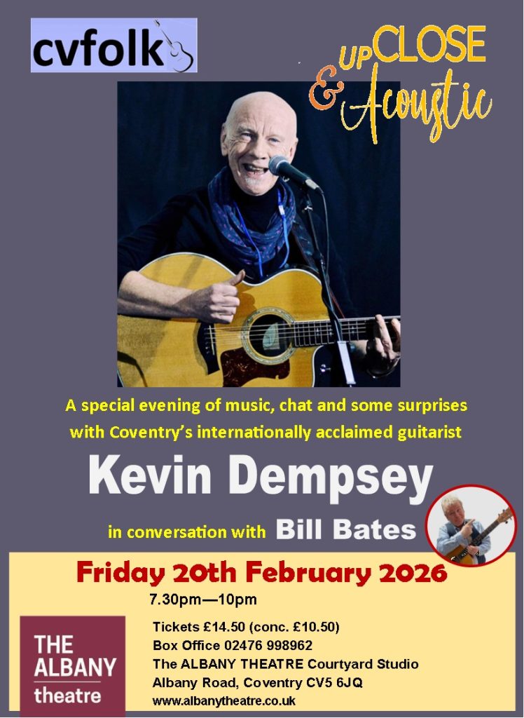 CV Folk offers another fascinating glimpse into the ‘inside story’ of a leading act on the local folk circuit. We’re delighted to welcome the highly acclaimed guitarist and singer-songwriter, Kevin Dempsey to play music and share personal insights in the Albany Theatre’s Courtyard Studio. As well as performing some of his impressive repertoire, he will […]